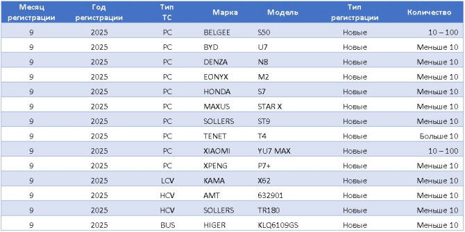 Эксперты агентства «АВТОСТАТ» и Объединенной Лизинговой Ассоциации (ОЛА) выяснили, что в течение сентября 2025 года на автомобильный рынок России вышло 10 новых легковых моделей, 2 грузовых, 1 легкая коммерческая (LCV) и 1 автобус. Все 14 моделей впервые появились в продажах новой автомобильной техники.