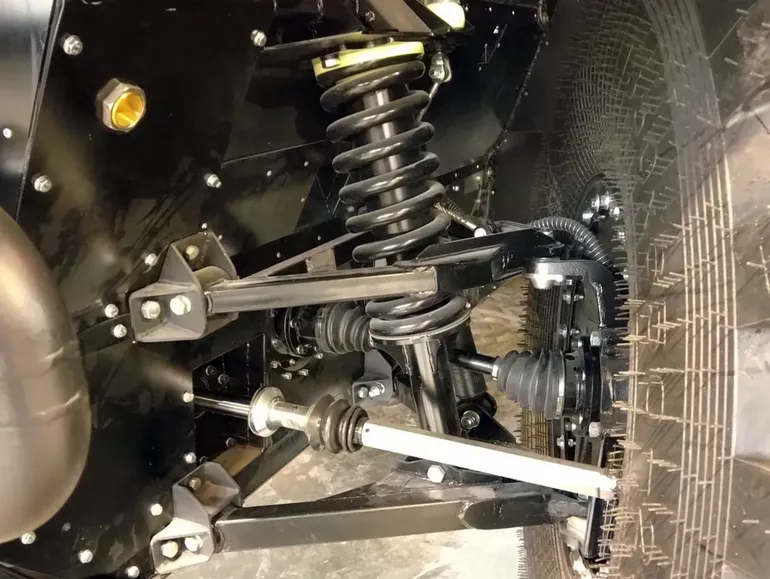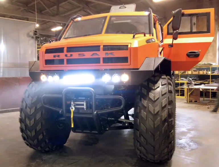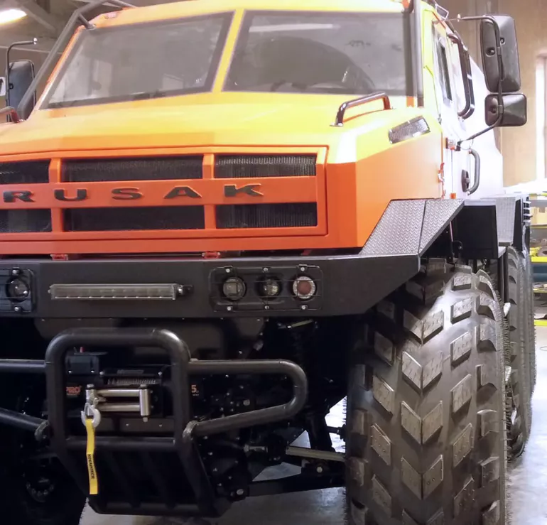 На всех вездеходах РУСАК используются бескамерные шины сверхнизкого давления 1650 х 650 — 25’’ собственной разработки компании. Также на собственном производстве для своих вездеходов здесь выпускают наиболее ответственные узлы и агрегаты трансмиссий, ходовой части, рамы-лодки и кузовов.