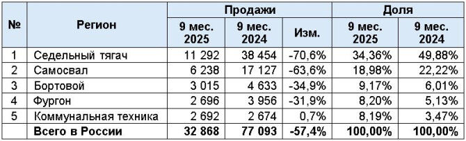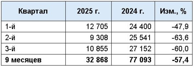 Согласно данным агентства «АВТОСТАТ», за 9 месяцев нынешнего года в России было реализовано 32 868 новых крупнотоннажных грузовых автомобилей (HCV – полной массой более 16 тонн), что на 57,4% меньше, чем в январе – сентябре 2024-го.