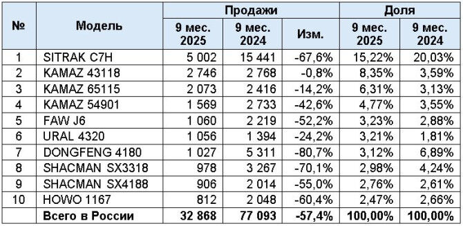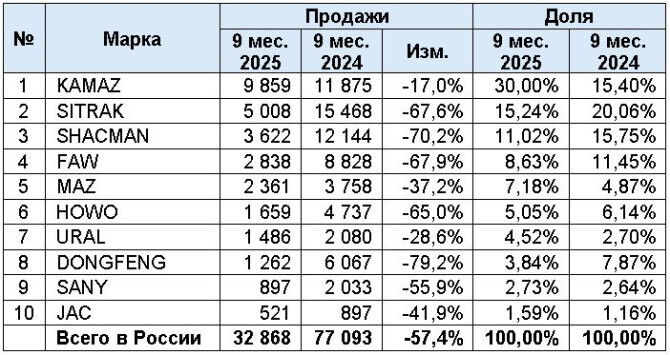 Лидером рынка новых HCV за отчетный период является отечественный бренд KAMAZ, доля которого составила 30%. При этом год назад она была почти вдвое меньше (15,4%). За 9 месяцев продано 9 859 таких крупнотоннажных автомобилей (-17% к АППГ).