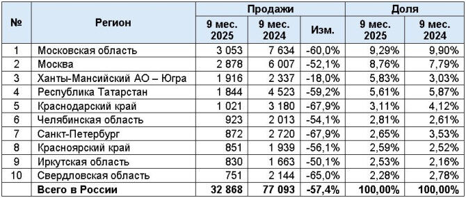 В региональном разрезе рынка новых HCV лидерство сохраняет Московская область с долей порядка 10% в январе – сентябре 2025 года.