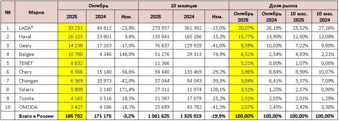 Лидерство на российском рынке по-прежнему сохраняет отечественная марка LADA*, на долю которой в середине осени пришлось чуть более 20% от общего объема, что в количественном выражении составляет 33 251 проданный экземпляр. При этом год назад (в октябре 2024-го) доля LADA* превышала 26%.