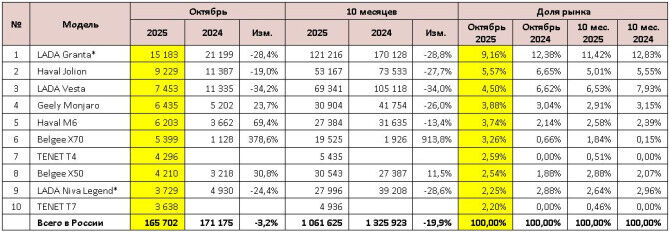 В модельном рейтинге все так же первенствуют автомобили семейства LADA Granta (в т.ч. произведенные на его базе), которые в октябре 2025-го были реализованы в количестве 15 183 единиц. Это на 28,4% меньше, чем год назад. Также стоит отметить, что доля «Гранты» за год снизилась более чем на 3 процентных пункта – с 12,38% до 9,16%.